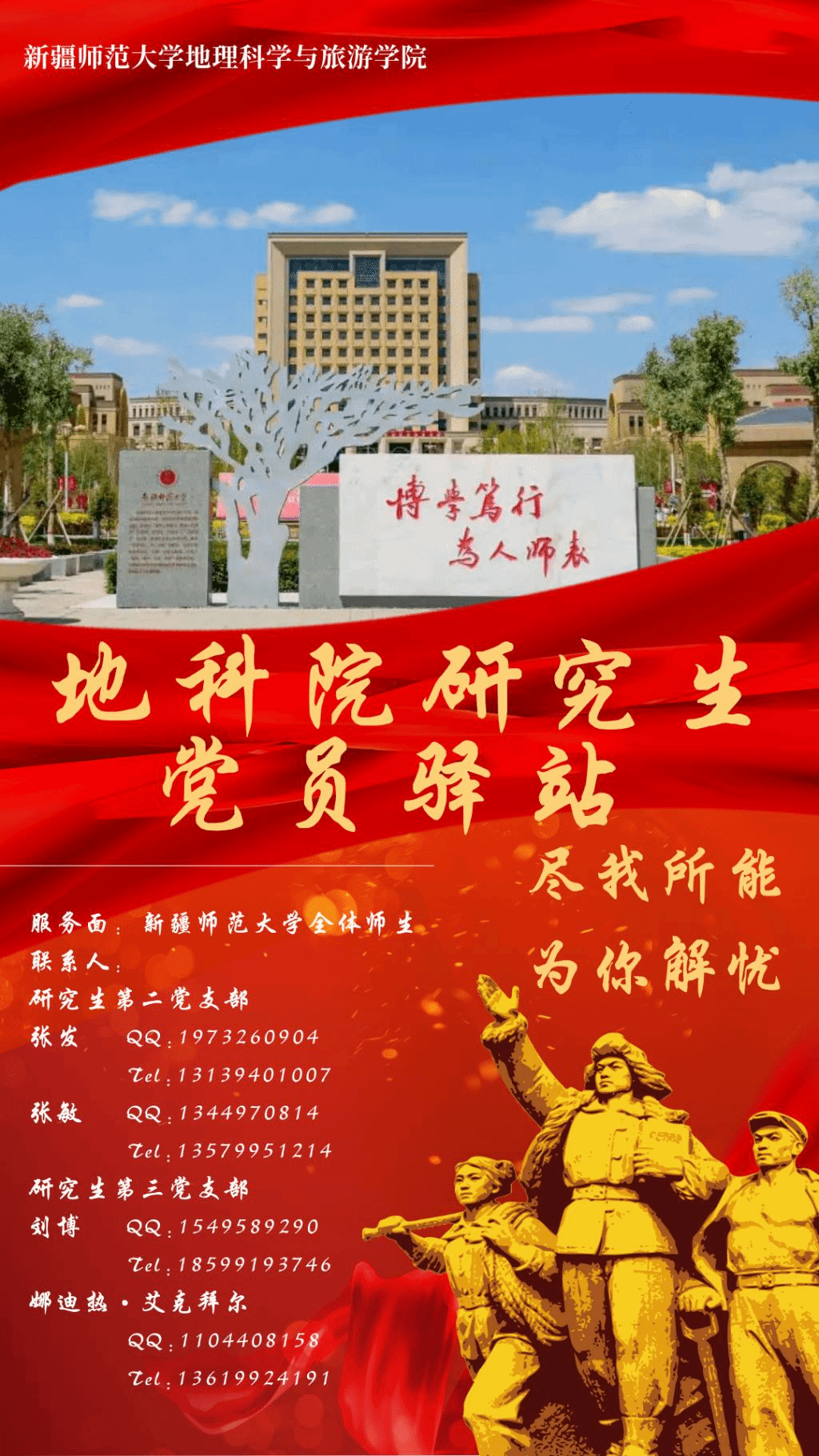 本着“全心全意为师生服务,踏踏实实树党员形象的宗旨,现西瓜看球 研究生第二党支部和第三党支部整合力量,建立地科院研究生党员驿站,为校内外有需要的师生提供力所能及的帮助。无论是师弟师妹需要了解咨询专业经验;还是校外校友因疫情不便,需委托校内同志帮忙办事;再或者……。在非盈利的前提下,我们经了解后尽可能的为您提供力所能及的帮助。如您需要帮助,可以联系海报中的联络员,我们的目标是:尽我所能,为你解忧。