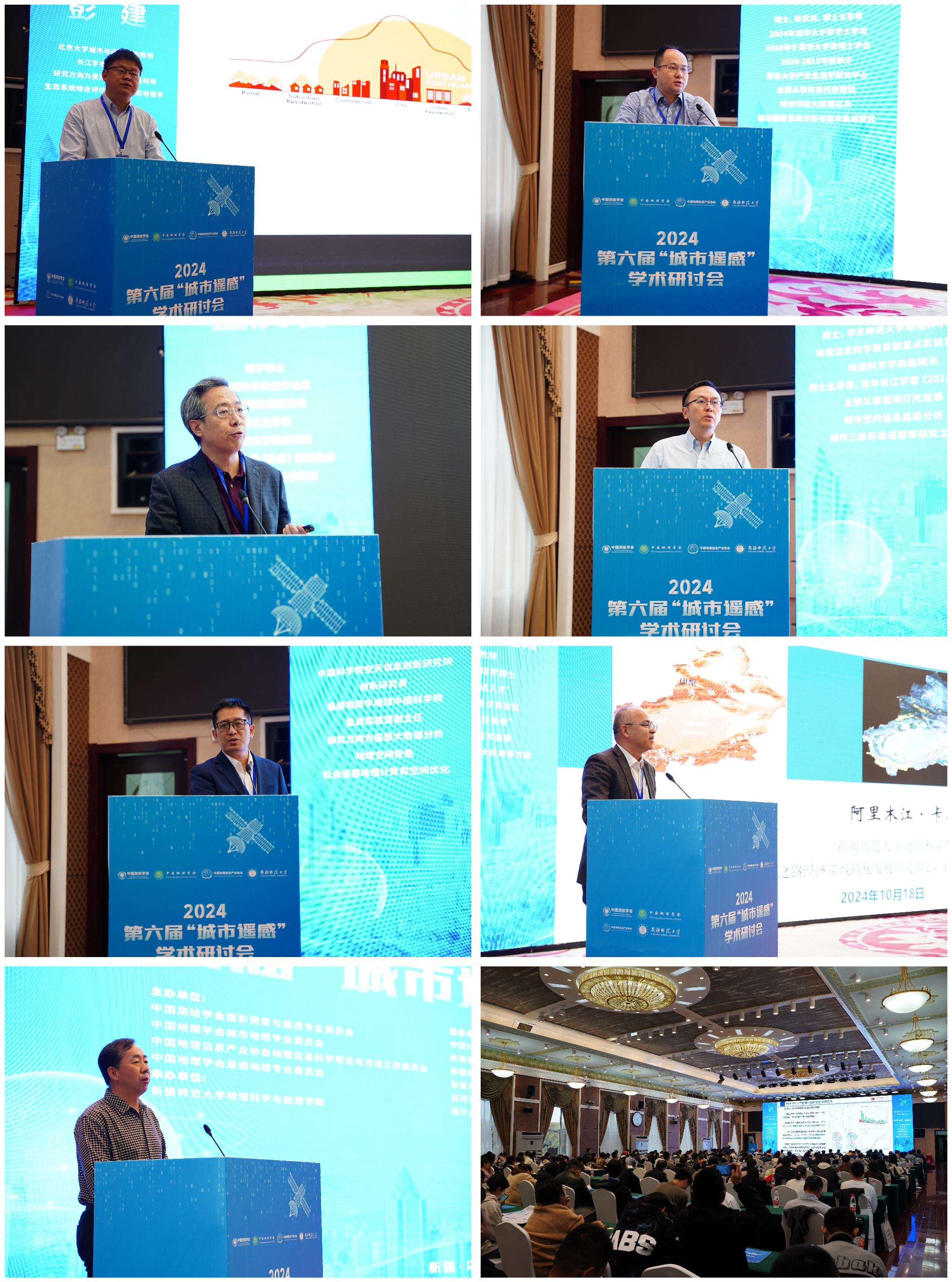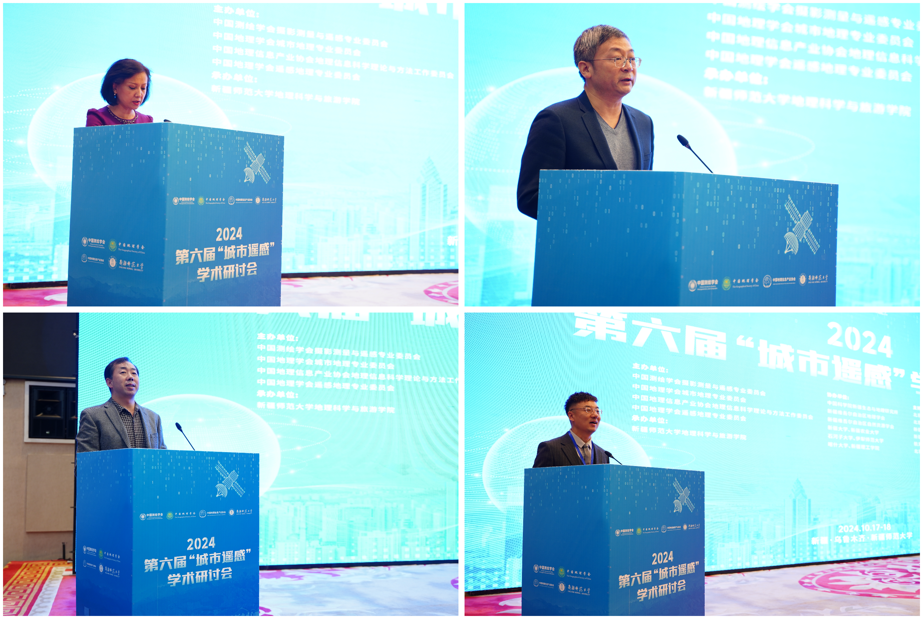 党委书记王勇辉教授主持。新疆师范大学党委、副校长帕提曼·吐尔逊在致辞中希望通过这次学术交流,能够汇集全国最先进、最前沿的思想和技术,共同探讨遥感技术在城市治理、环境保护、可持续发展等方面的应用潜力,为构建绿色、智慧、和谐的人类命运共同体贡献智慧和方案。中国地理学会城市地理专业委员会主任甄峰教授在致辞中指出本届大会设置了多个专题,涵盖了城市场景智能解译与监测、城市土地覆盖分类与变化检测、城市生态环境遥感、遥感AI支持的城市可持续发展等多个方面。这些专题紧扣当前城市遥感研究的热点和难点,充分展现了遥感技术在推动城市可持续发展中的重要作用。中国地理学会遥感地理专业委员会杜培军教授在致辞中介绍了城市遥感学术研讨会定位与发展历程。