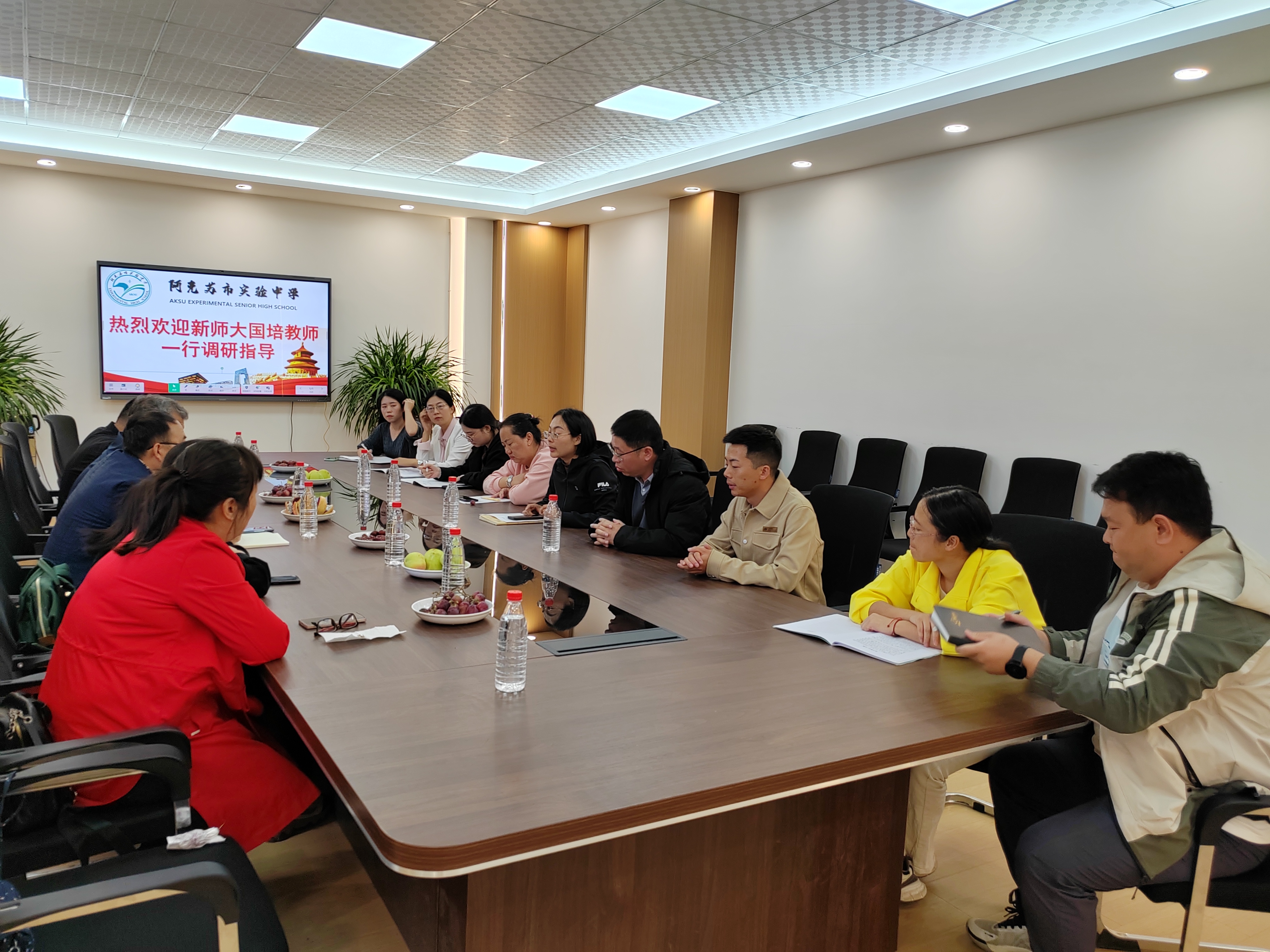 阿克苏分队成员重点在阿克苏市实验中学开展地理学科基层调研座谈会。阿克苏市实验中学党总支副书记、校长,高三年级地理组长以及全体高三地理教师参加了座谈会。双方分别对学校的基本概况、教师团队建设、学科建设做了详细介绍。然后双方就目前高中地理教学现状,高考对学生核心素养培养、调研基层教师培训的需求及对地理科学专业毕业生学科知识、素质能力要求等问题进行了深入讨论。