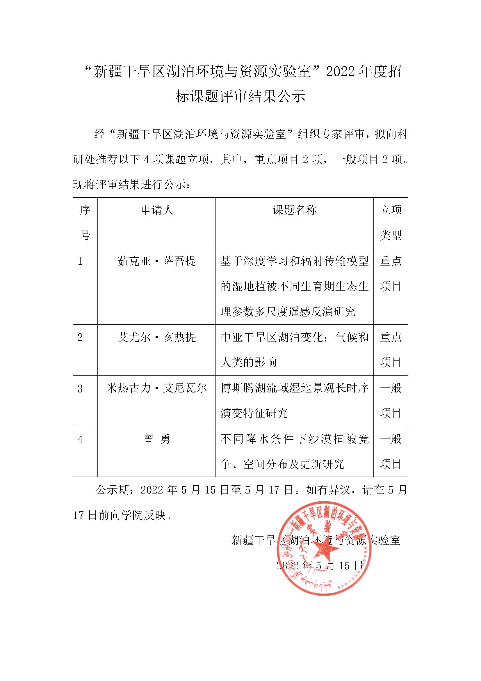 “新疆干旱区湖泊环境与资源实验室”2022年度招标课题评审结果公示